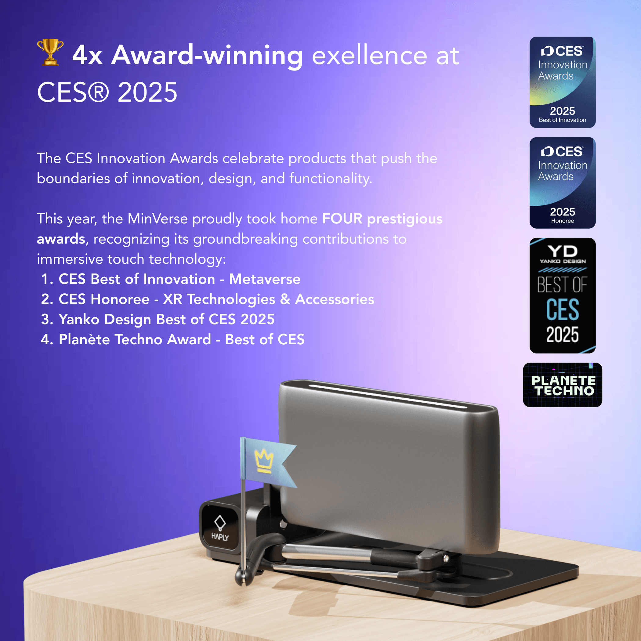 The Minverse and the collective work of the Haply Robotics team were recognized at CES 2025 with four awards, including the prestigious “Best of Innovation”, selected from over 3,400 entries. This international recognition highlights the Minverse’s technical excellence, design, and ergonomics, while confirming Haply Robotics’ position as a leader in haptic interfaces.